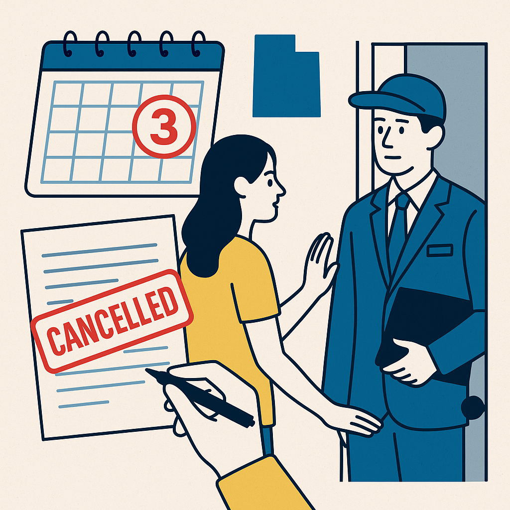 You have probably had that knock at the door, a salesperson pitching a cleaning system, solar panels, or a home security plan that sounds great in the moment. If you change your mind after signing, Utah law gives you a short cooling-off period for certain door-to-door sales so you can cancel without penalty. Bottom line up front: learn when the 3-day cancellation rule applies, how to cancel the right way, and how to protect yourself from common solicitation scams.