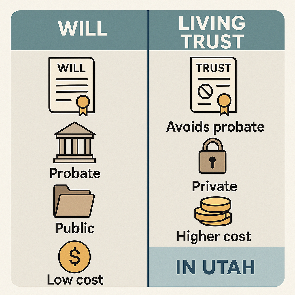 Plain-English guide to how wills and living trusts work in Utah, including probate, privacy, costs, funding, and a simple decision checklist