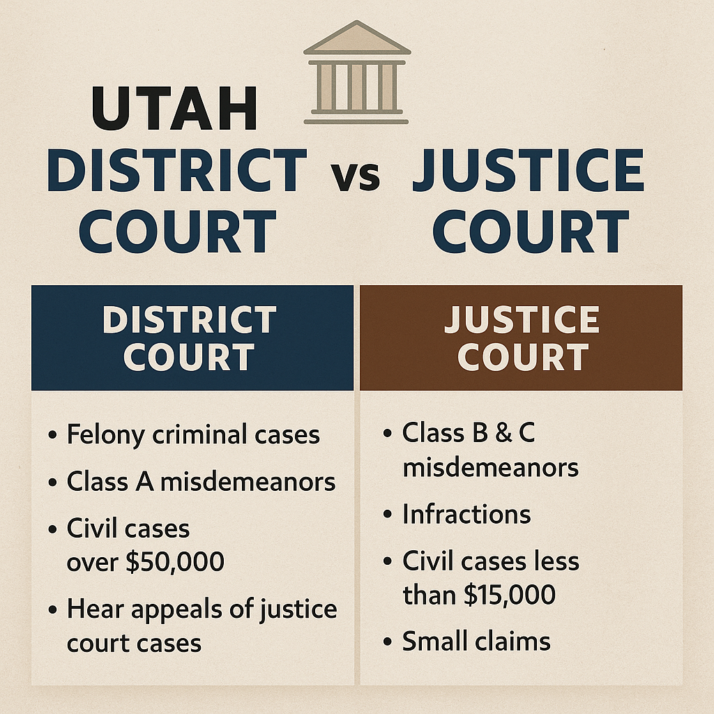District Court is Utah’s main trial court for serious criminal, larger civil, family, and probate matters. Justice Court is a city or county level court for lower level misdemeanors, traffic, and smaller civil disputes.